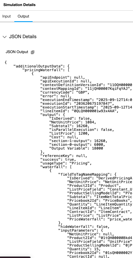 We can then run Simulate which produces a full JSON data trail of the Pricing Procedure execution, element by element plus a description of the price waterfall output.